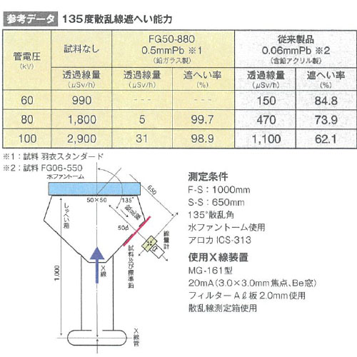 従来製品(FG06-550:含鉛・アクリル0.06mmpb、FG50-770:鉛ガラス0.5mmpb)の
