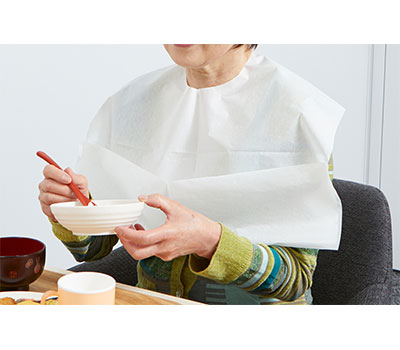 ●表面が吸水、裏面が防水加工の使い捨てエプロン。