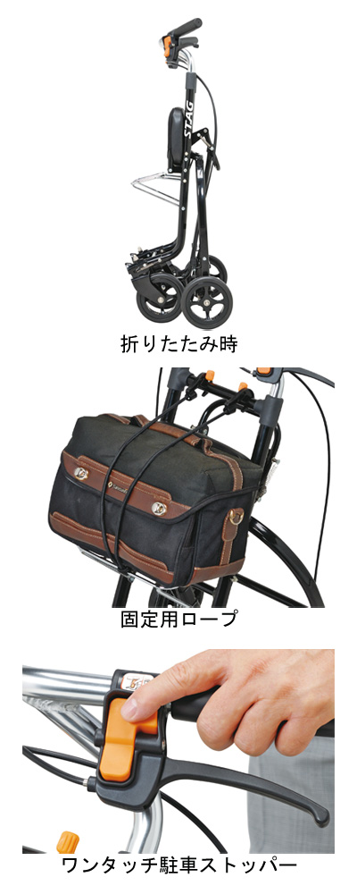 ●標準機能/折りたたみ、2WAYキャスター(左右55°、固定)、手元ブレーキ、駐車ブレーキ、座面、杖・傘立て