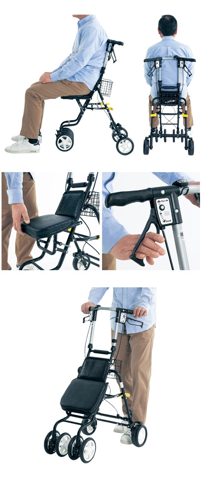 ●標準機能/折りたたみ、2WAYキャスター(左右60°、固定)、手元ブレーキ、駐車ブレーキ、座面、杖・傘立て