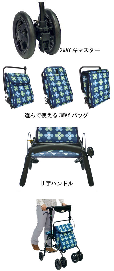 ●標準機能/折りたたみ、2WAYキャスター(左右60°・固定)、手元ブレーキ、駐車ブレーキ、座面、杖・傘立て、保冷、ベル(警音器)