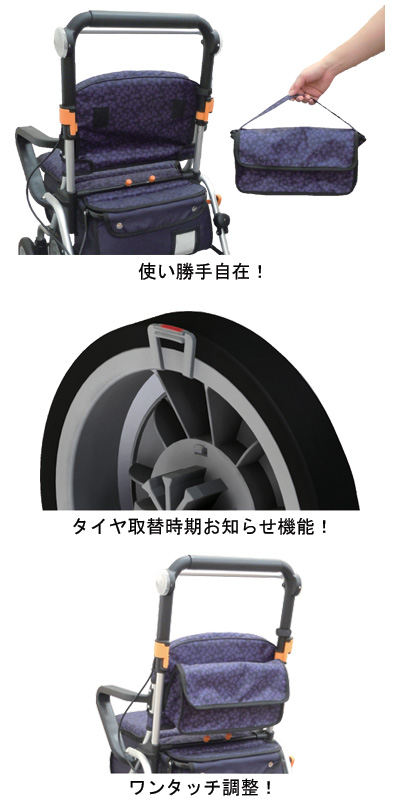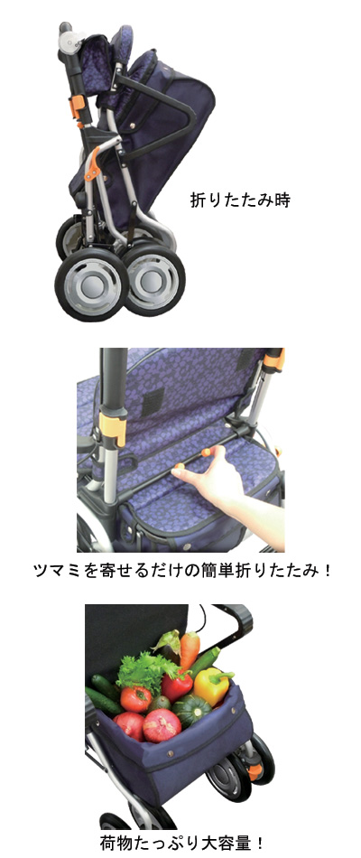 ●標準機能/折りたたみ、3WAYキャスター(360°・左右45°・固定)、手元ブレーキ、駐車ブレーキ、座面、杖・傘立て