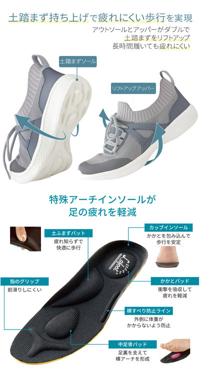 ●土踏まず持ち上げで疲れにくい歩行を実現。