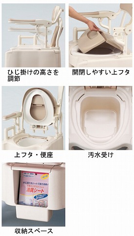 ●サイズ/幅55×奥行56×高さ76~92cm、座面:幅36×奥行40cm、穴部:幅19×奥行29cm、便座高:33~49cm、ひじ掛け高:21~27cm(3段階/3cm)、ひじ掛け内寸:40cm