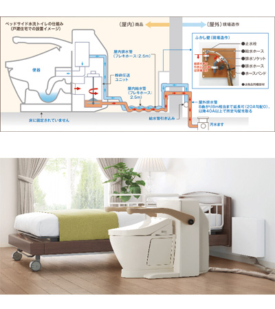・ベッドのすぐそばに後付で設置可能な水洗トイレが介護をする方の様々な問題を改善します。排泄後の後処理が不要となるため、においも残りにくく脱臭機能も付いております。
