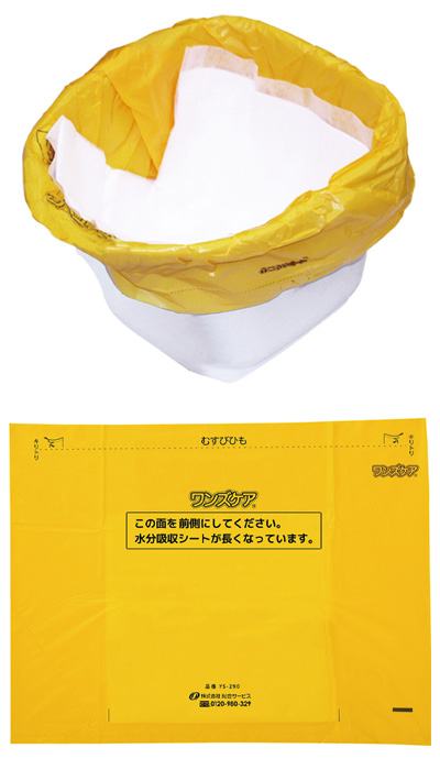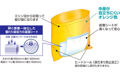 ・袋と抗菌ポリマー入り吸収シートが一体化し、セットも後処理も簡単。