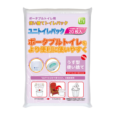 【商品説明】・1回(最大2、3回吸水可能)使い捨てで手軽に使えるユニトイレパック。 ・「広げてかぶせて使うだけ」の簡単使用。 ・吸水シートが袋の底に圧着されているので、排泄時の音を吸収します。 ●サイズ(1枚当たり)/55×65cm ●重さ/800g ●材質/吸水シート:吸水ポリマー・綿状パルプ、袋:ポリエチレン ●吸水量目安/約500cc ●生産国/日本