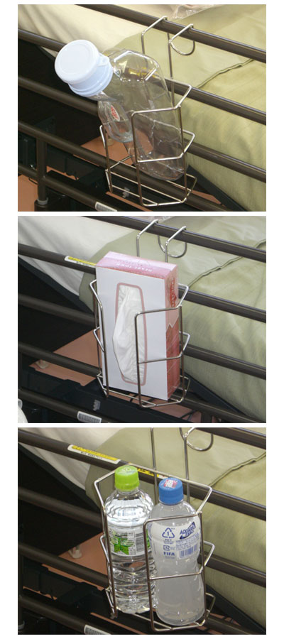 ・尿器だけでなく、ベッドガードに掛けてペットボトルやテッシュBOXの収納にも便利で、ベッド周りがスッキリします(ペットボトルは通常500mLタイプが2本収まります)。