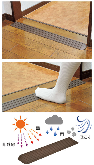 【商品説明】●小さな段差による歩行時のつまずき防止や、車いす走行時の負担を軽減するための低段差スロープ。 ●耐久性の高い特殊なエラストマー素材により、屋外から屋内まで広範囲に使用できます。 ●サイズ/幅111×奥行19×高さ5cm ●材質/特殊エラストマー ●生産国/日本