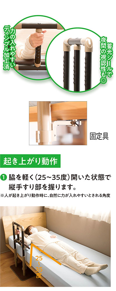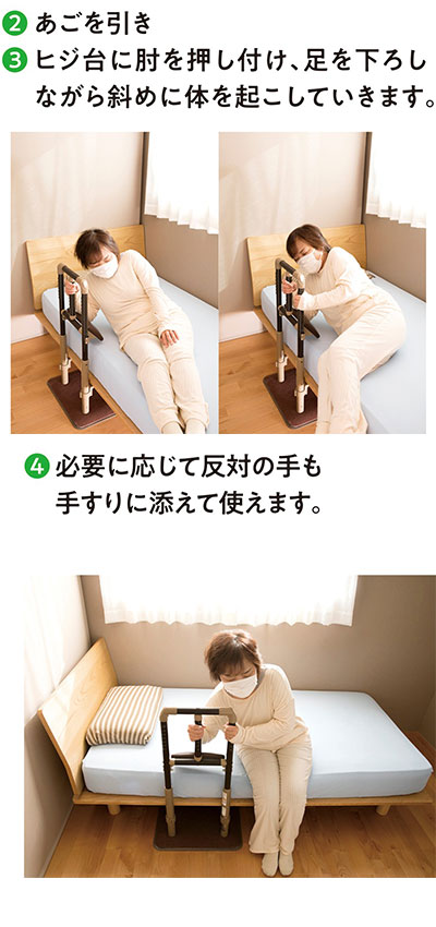 ●てこの原理で起き上がりに特化したこれまでにないヒジ台付き置き型手すり。