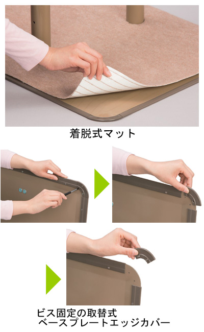 ●ビス固定の取替式ベースプレートエッジカバー(接着剤未使用で、着脱が容易)。
