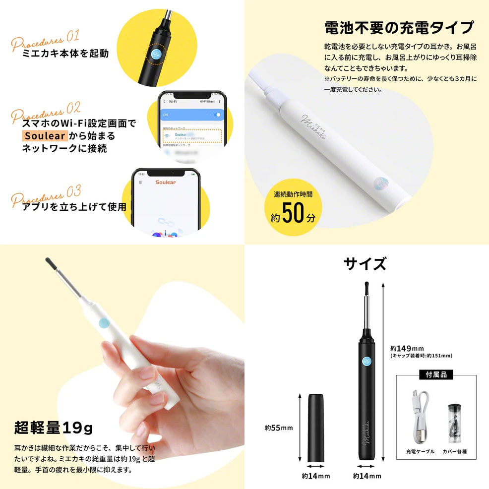 ワイヤレスカメラ付き耳かき ミエカキ 3R-BBD02WT ホワイト スリーアールソリューション