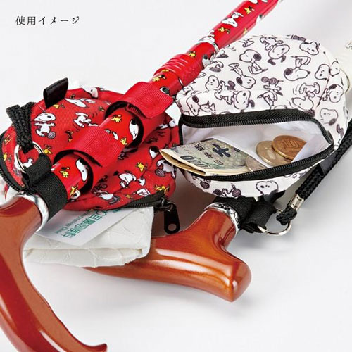 【商品説明】スヌーピーのイラスト付のステッキポーチ ●杖や車いす、シルバーカー等に装着可能 ●カラー:スヌーピー赤 ●サイズ:幅9×奥行6×高さ11cm ●重量:約23g ●材質:生地(ポリエステル)、取付ベルト(PU) ●JANコード:4548643-098207