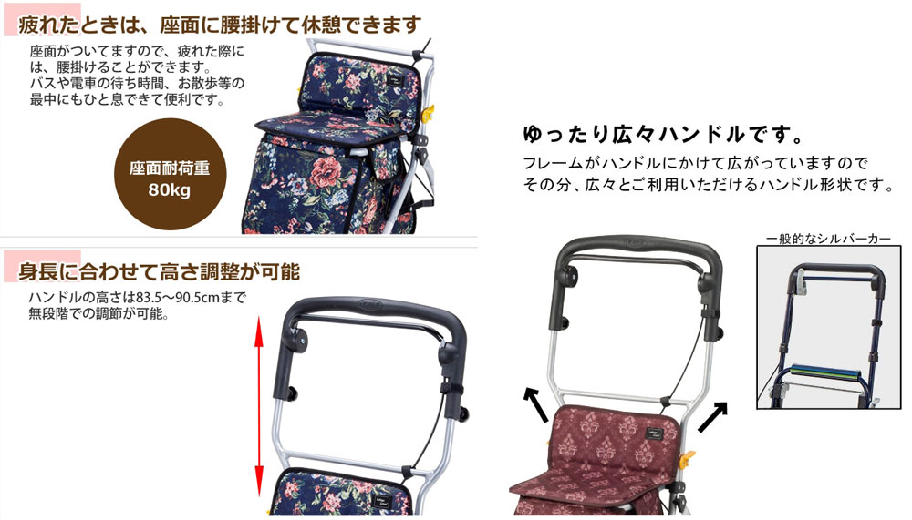 2WAYキャスター仕様の広々ハンドルのミドルタイプシルバーカー