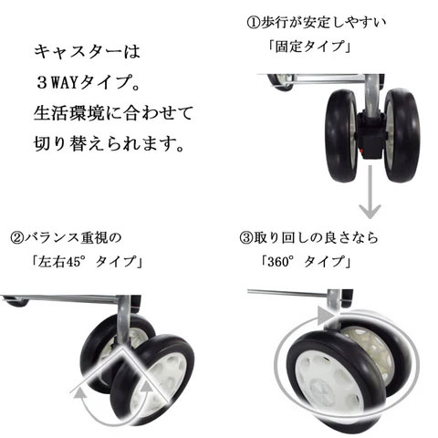 ●前輪は固定、左右45度、360度のいずれかに設定可能な3WAYタイプ
