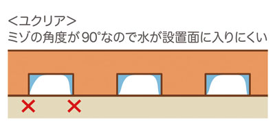 ●ミゾの角度が90°なので水が接地面に入りにくい。