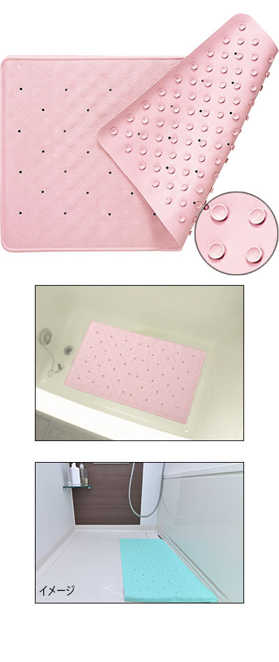 【商品説明】●裏面に吸盤のついたバスマットです。 ●浴槽内でも使用できます。 ●サイズ/幅69.5×長さ39.5×厚さ0.1cm ●重さ/0.7kg ●材質/天然ゴム ●使用場所/浴槽内、洗い場 ●生産国/中国 ●吸盤タイプ