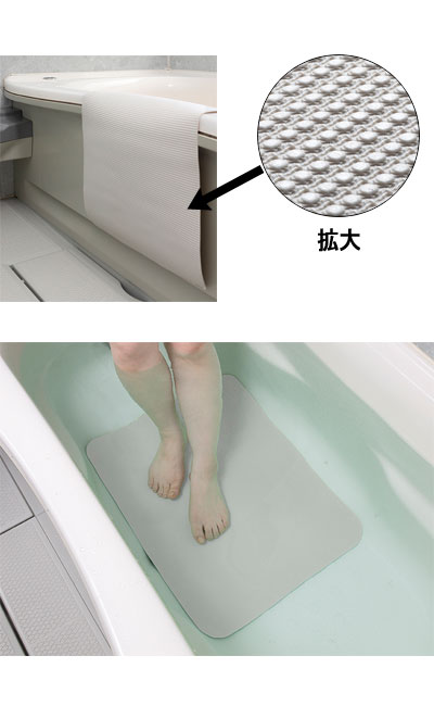 【商品説明】●浴槽内での足元やお尻のスベリを防止します。薄くてもしっかりと浴槽の底に沈みます。 ●表面はなめらかで、スベリ止めにすぐれたシボ加工。 ●サイズ/幅60×長さ45×厚さ0.2cm ●重さ/750g ●材質/SBR ●耐熱温度/60℃ ●使用場所/浴槽内 ●生産国/台湾 ●浴槽内専用