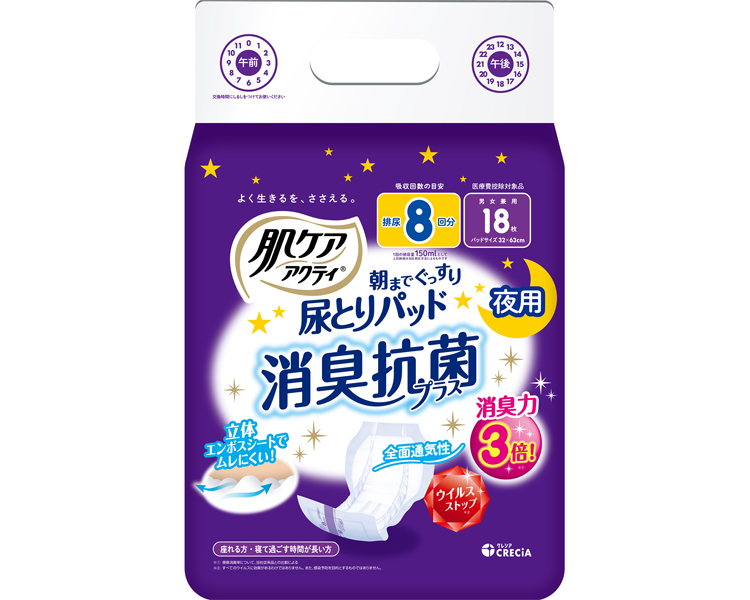 肌ケア アクティ 尿とりパッド消臭抗菌プラス 8回分吸収 ケース単位 6袋セット 1袋18枚入り 80498 日本製紙クレシア