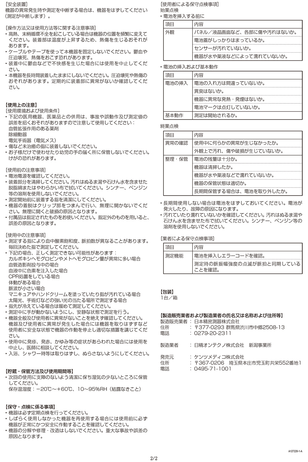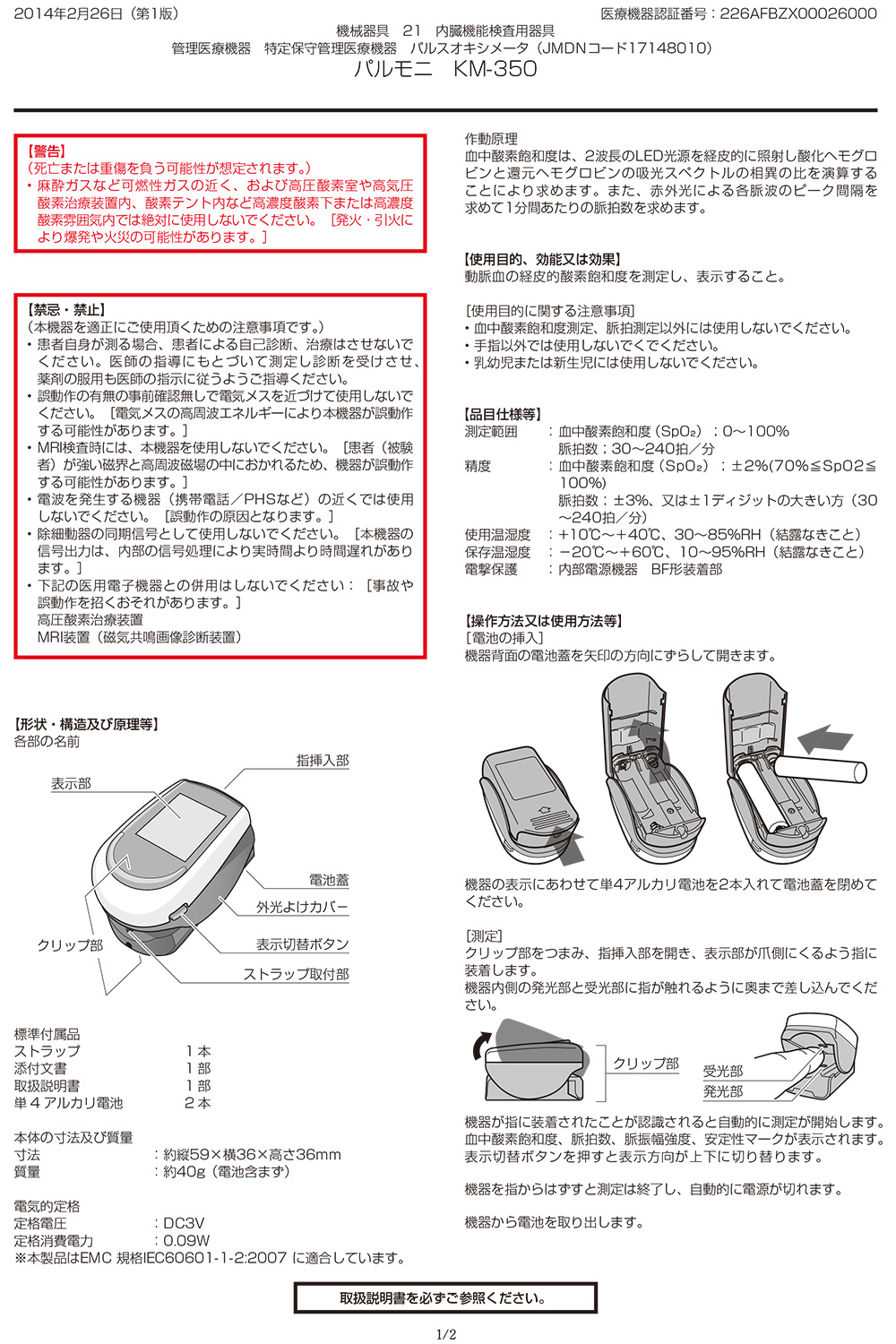 ●測定精度:SpO2=±2%(70~100%)、脈拍=±3%または±1digitの大きい方
