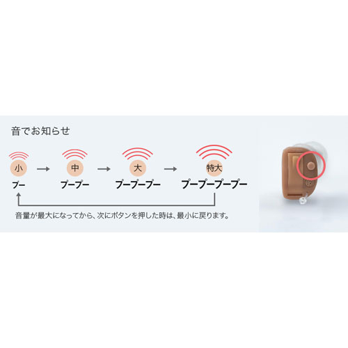小型形状(同価格帯補聴器で最小)、目立たない肌色、日本人の耳の形状に合わせた、左右別形状