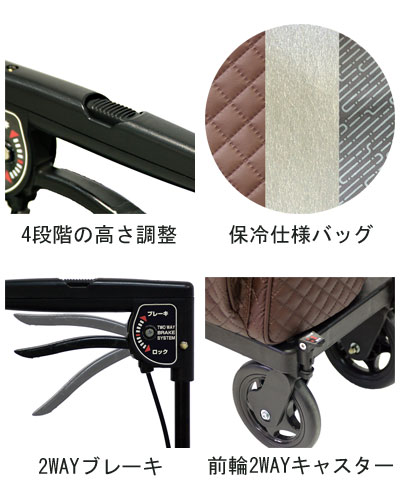 ●標準装備/2WAYキャスター(左右50°、固定)、手元ブレーキ、駐車ブレーキ、杖・傘立て、保冷