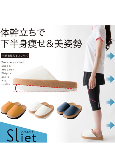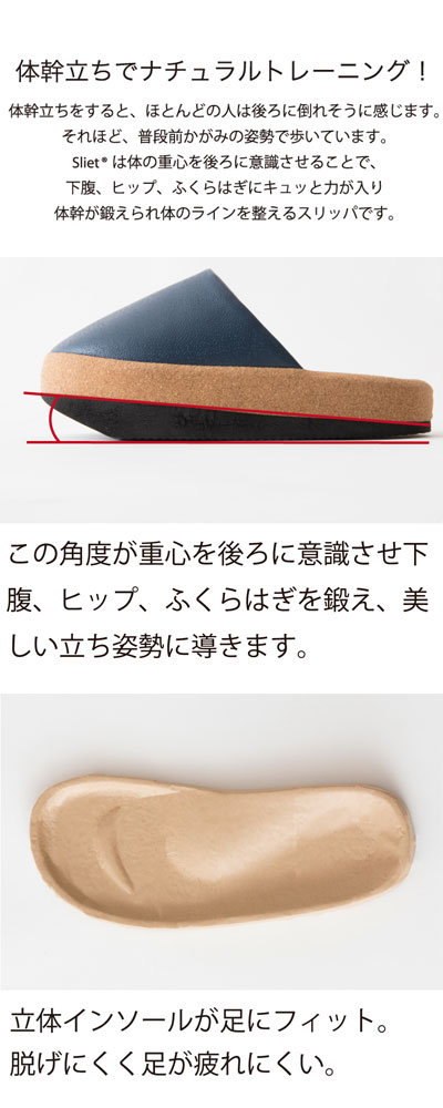 ●体の重心を後ろに意識させることで、下腹、ヒップ、ふくらはぎにキュッと力が入り体幹が鍛えられ体のラインを整えるスリッパです。
