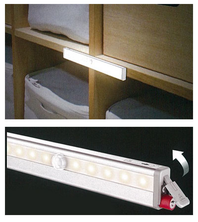 ・「どこでもライト」は周囲が暗い環境でセンサーが感知エリア内で動くものを感知すると点灯するセンサー式LEDランプです。