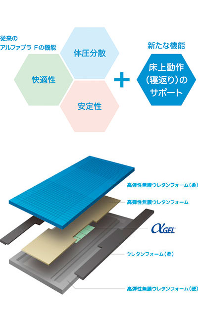 ・従来のアルファプラFの体圧分散性能・快適性・安定性を保ちつつ、ご自身によるマットレス上での動きをサポートする新たな機能を導入しました。