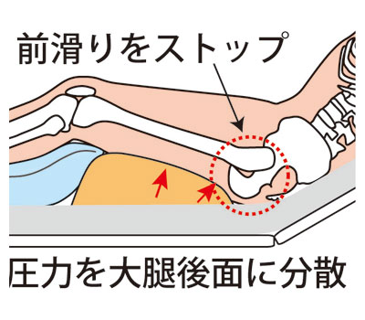 ●臀部の圧力を大腿後面に分散し、前滑りを防止します。