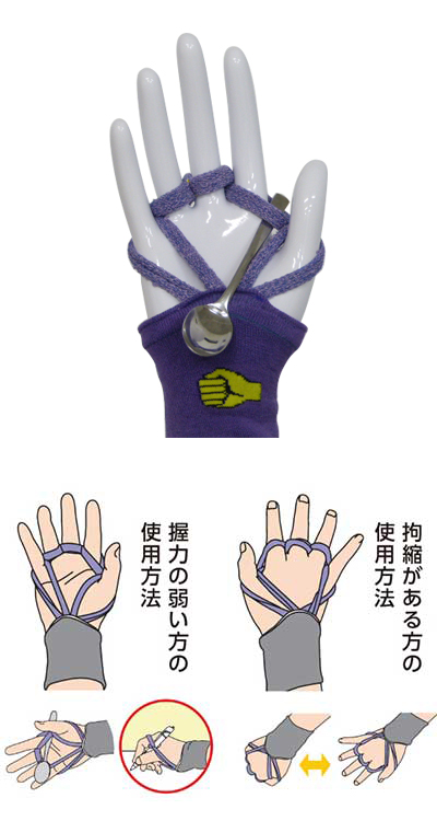 ●手指の間に輪を入れ、拘縮予防やスプーン、筆記用具の保持を助ける。