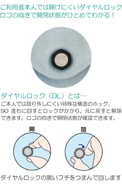 ●ダイヤルロック(DL)とは・・・ご本人では取り外しにくい特殊な構造のホック。90°右に回すとロックがかかり、元に戻すと解除できます。ロゴの向きで開閉状態が確認できます。ダイヤルロックの黒いフチをつまんで回します。