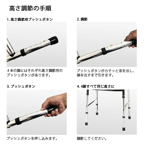 ●主材質:本体(アルミ)、グリップ(TPR)、先ゴム・キャスター(PVC)、後脚ストッパー部(PA)、樹脂部(PP)