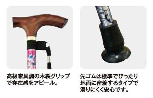 【商品説明】高級家具調の木製グリップ ●滑りにくい密着タイプの先ゴム ●伸縮10段階調節可能(2.5cm間隔) ●アルミ製支柱 ●カラー:黒花柄 ●長さ:68.5~91cm 10段階調節 (2.5cm間隔) ●杖先ゴム:16Φ(ブラックDDP-16BK) ●重量:約260g ●材質:支柱(アルミ)、握り部(木製)、ストラップ(ナイロン) ●JANコード:4968501-994906