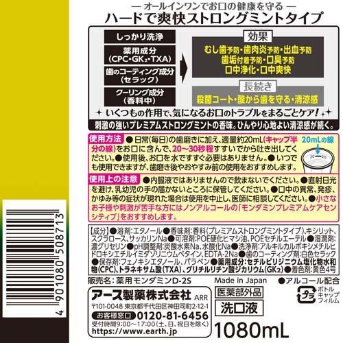 ●成分:溶剤:エタノール、香味剤:香料(プレミアムストロングミントタイプ)、キシリット、スクラロース、サッカリンNa、可溶剤:POE硬化ヒマシ油、POEセチルエーテル、湿潤剤:濃グリセリン、pH調整剤:炭酸水素Na、水酸化Na、洗浄剤:アルキルカルボキシメチルヒドロキシエチルイミダゾリニウムベタイン、EDTA-2Na、歯のコーティング剤:白色セラック、保存剤:フェノキシエタノール、パラベン、薬用成分:セチルピリジニウム塩化物水和物(CPC)、トラネキサム酸(TXA)、グリチルリチン酸ジカリウム(GK2)、着色剤:黄色4号