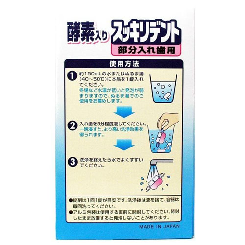 【商品説明】ミントの香りの酵素入り入れ歯洗浄剤 ●5分間で除菌率99.9%の強力除菌 ●酵素配合でしっかり洗浄 ●白洗浄成分がニオイをスッキリ消臭 ●部分入れ歯兼用 ●内容量:120錠 ●成分:漂白剤(過硫酸塩、過ホウ酸塩)、陰イオン、系界面活性剤、酵素、漂白活性化剤、炭酸塩、クエン酸、重炭酸塩、結合剤、滑沢剤`香料、色素 ●液性:弱アルカリ性 ●原産国:日本