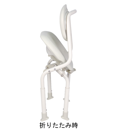 ●浴室を広くつかえるコンパクトタイプのシャワーチェア。座面後方のレバーを下げて背もたれを持ち上げるだけで、簡単に折りたためます。