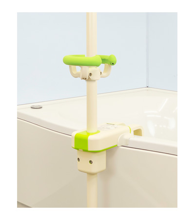 ●ユニットバスに取り付け可能な縦型手すり「マスカット」ポールタイプ。天井への負担が小さく、浴槽のエプロンを触ることなく取り付けが可能です。