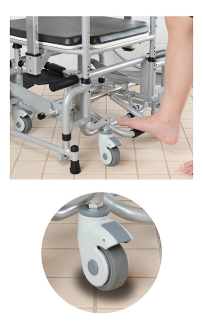 ●1カ所でしっかりブレーキ。ブレーキを踏むと四隅の脚が下がり、キャスターを浮かせます。
