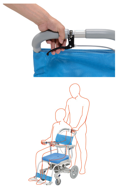 ●ひじ掛けが前倒れ防止に。シートを傾けて座位を安定。コンパクトなシャワーキャリー。
