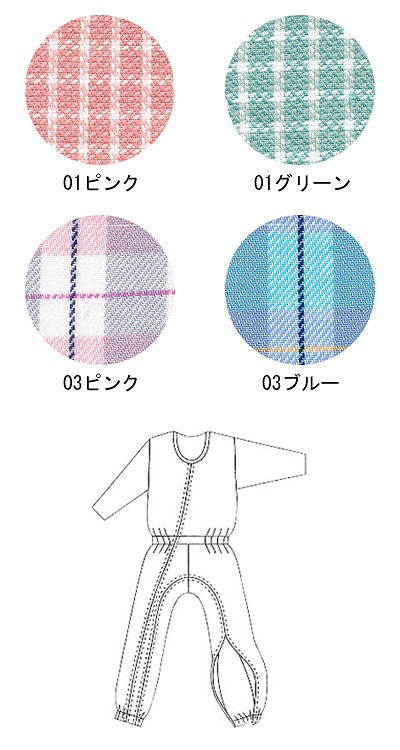 【商品説明】●簡単には脱げない工夫。 ●おむつ交換、着替えがスムーズにできます。 ●播州織先染。 ●素材/01グリーン・01ピンク:綿100%(ノーホルマリン)、03ブルー●03ピンク:綿70%●ポリエステル30% ●生産国/日本 ●洗濯機可 ●脱水機可 ●乾燥機不可 ●通年用 ●男女兼用