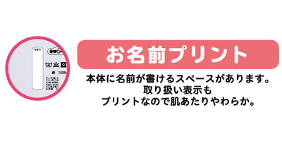 ●お名前プリント。本体に名前が書けるスペースがあります。取り扱い表示もプリントなので肌あたりやわらか。