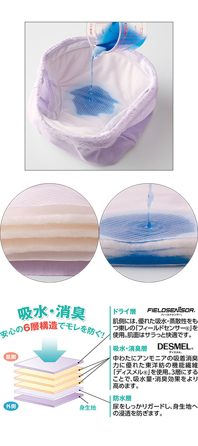 ●吸水部分は、東洋紡の「ディスメル」を3層使用。高い吸水性と優れた消臭力をもたらします。