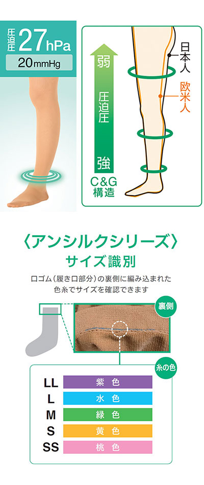 ●足首の圧迫圧は27hPa(20mmHg)で、中程度の圧迫が得られます。