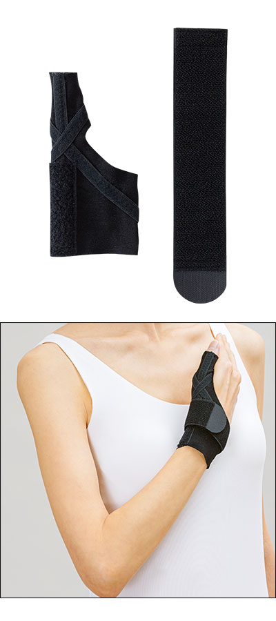 ●クロステーピング構造。親指から手首までの関節をクロスサポートすることで、親指の曲げを抑制し安定させます。