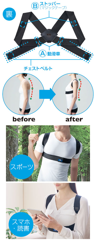 ●背中のレザータイプの支点からなる肩ベルトとウエストベルトの引力が肩甲骨を引き寄せ、後方へ働くことで、上体がピンと起き上がり、美しい姿勢をづくりを楽にサポートします。