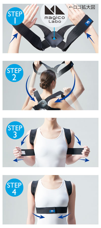 ●背中のレザータイプの支点からなる肩ベルトとウエストベルトの引力が肩甲骨を引き寄せ、後方へ働くことで、上体がピンと起き上がり、美しい姿勢をづくりを楽にサポートします。