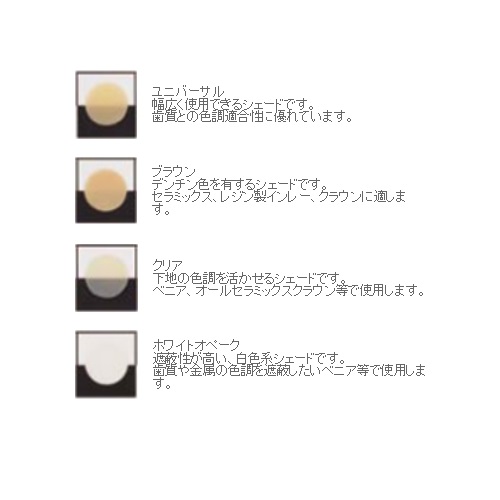 ●4色の色調で※各種審美修復材料(歯科用陶材・セラミックス・レジン系材料)の装着に適した接着性および理工学物性を有しています。