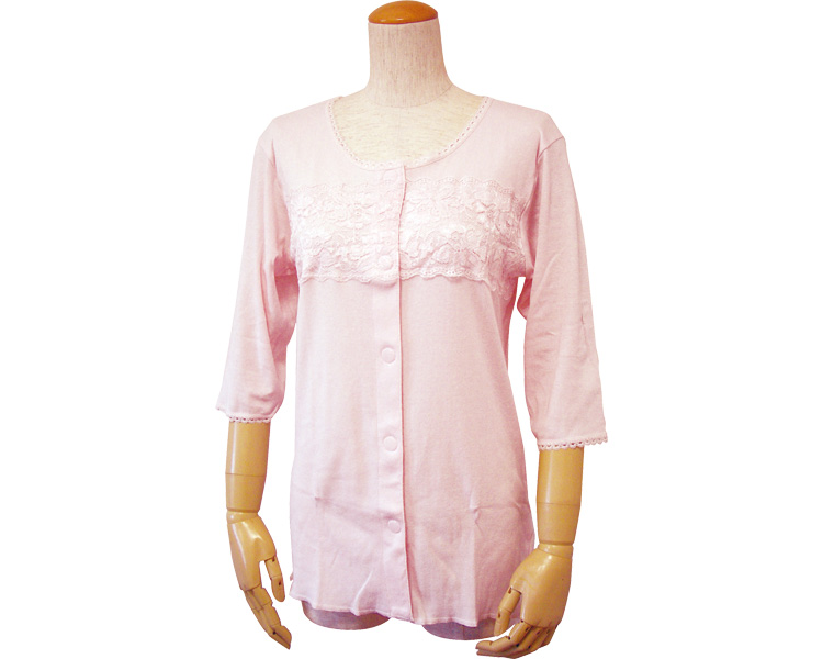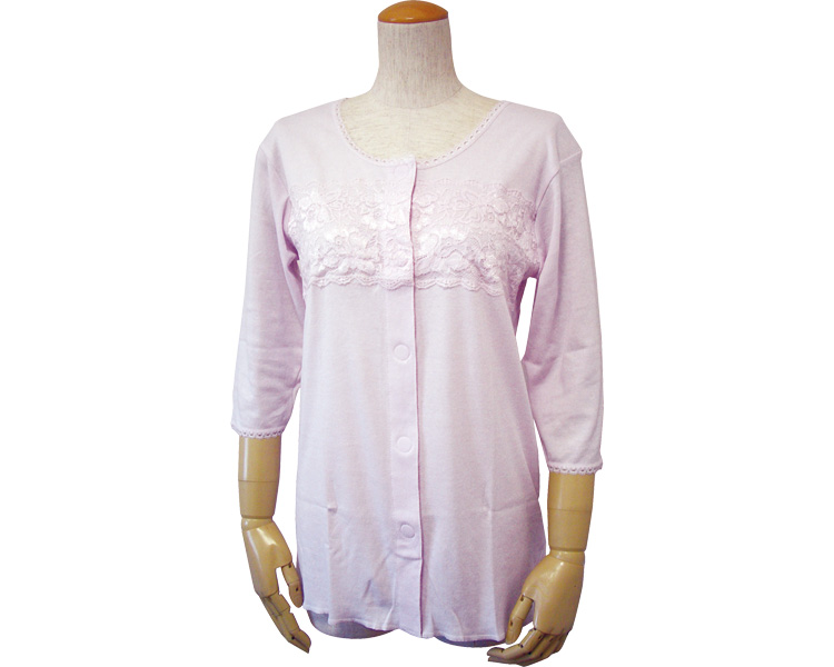 婦人七分袖胸レース付き前開きシャツ(ワンタッチテープ式)